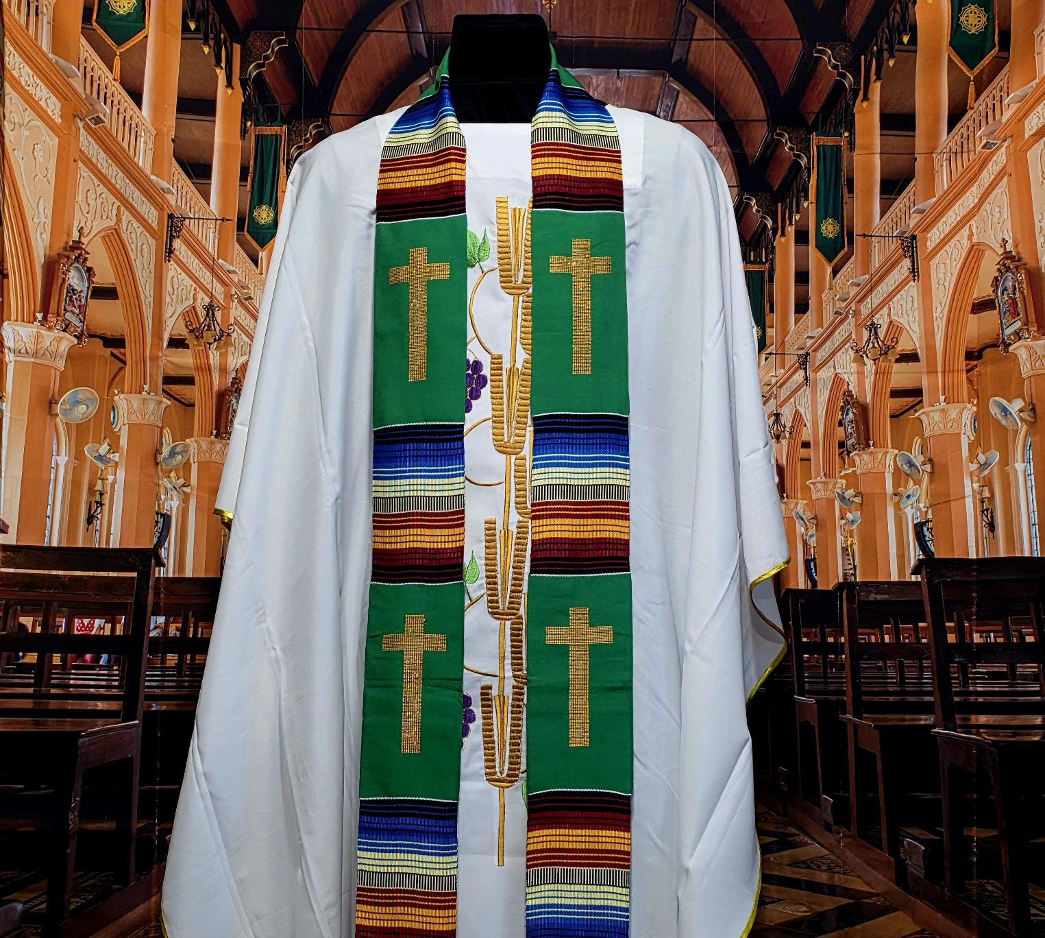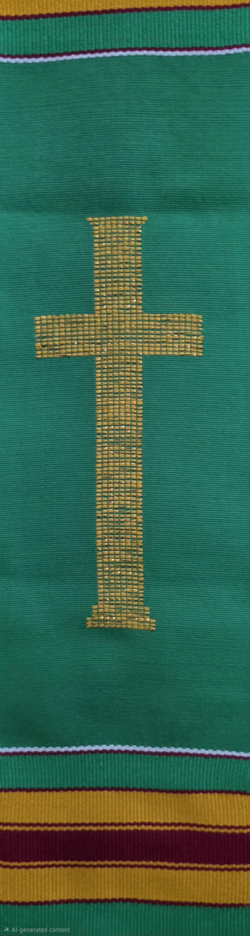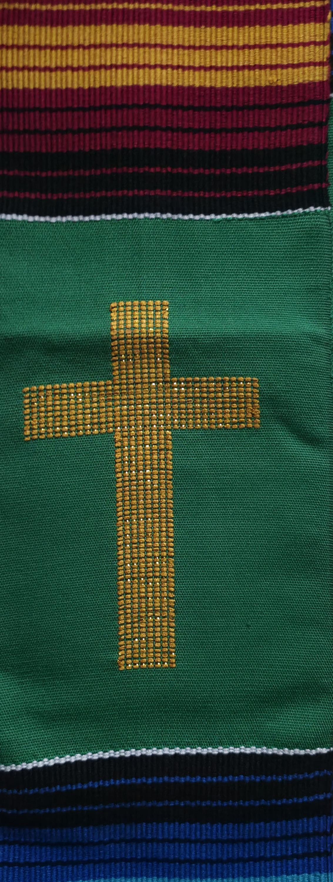 Multicultural Green Kente Clergy Length Stole.