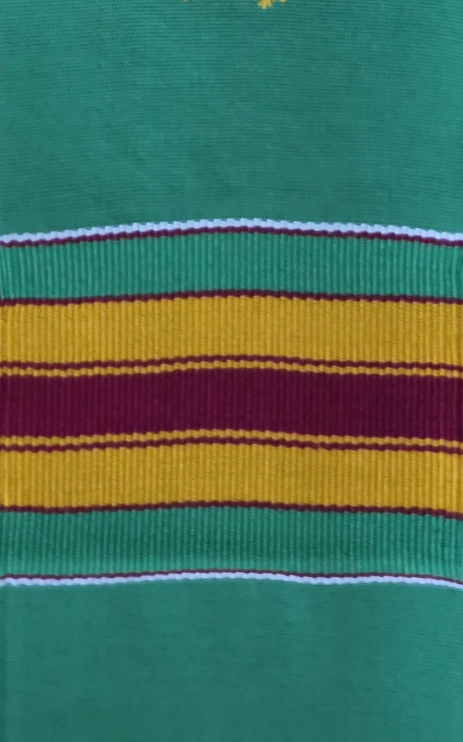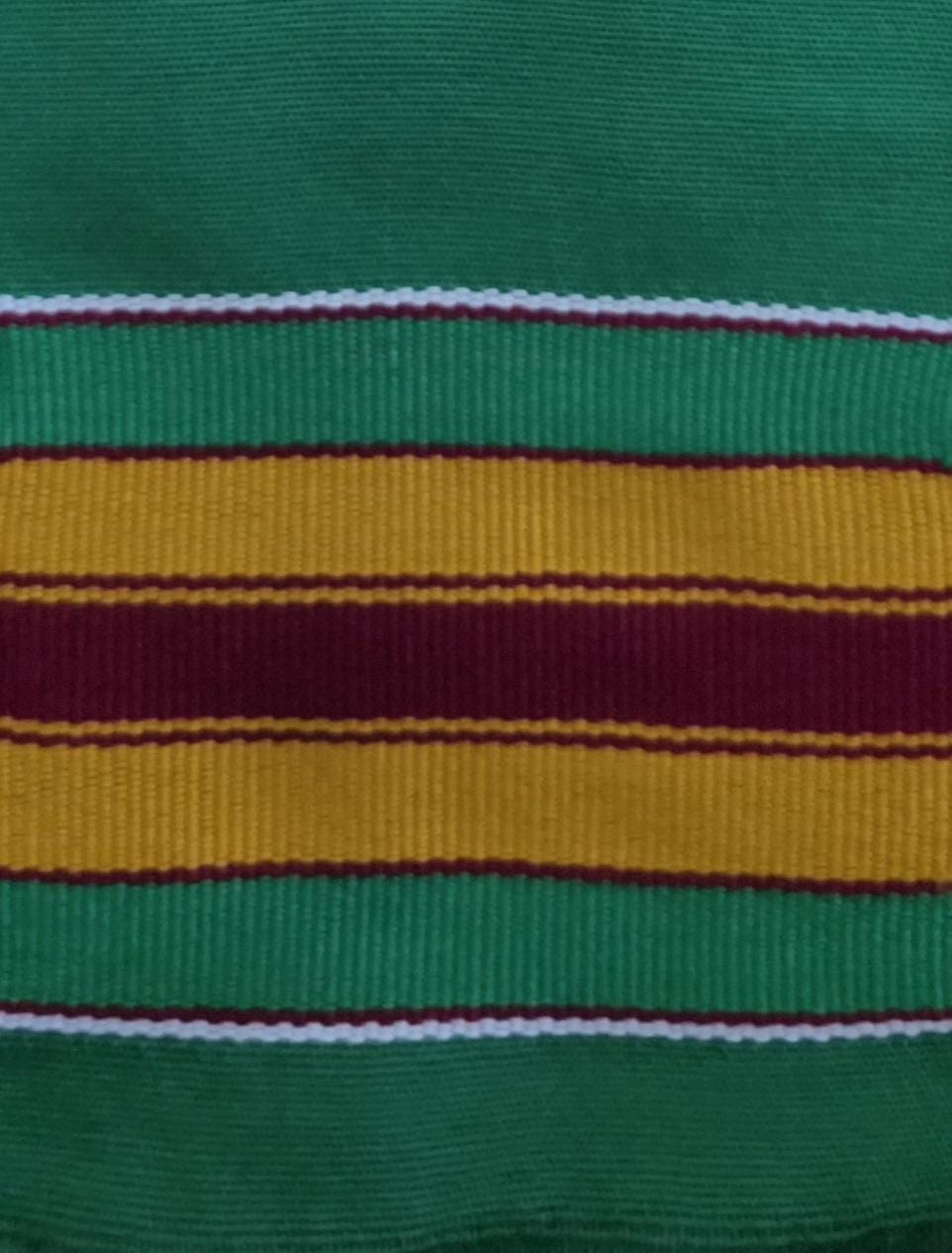 100"L x 4.5"W. Handwoven in Ghana. All kente stoles measurements are approximate. Since they are handwoven by numerous weavers/looms, it is impossible for all to be exactly the same length and width.