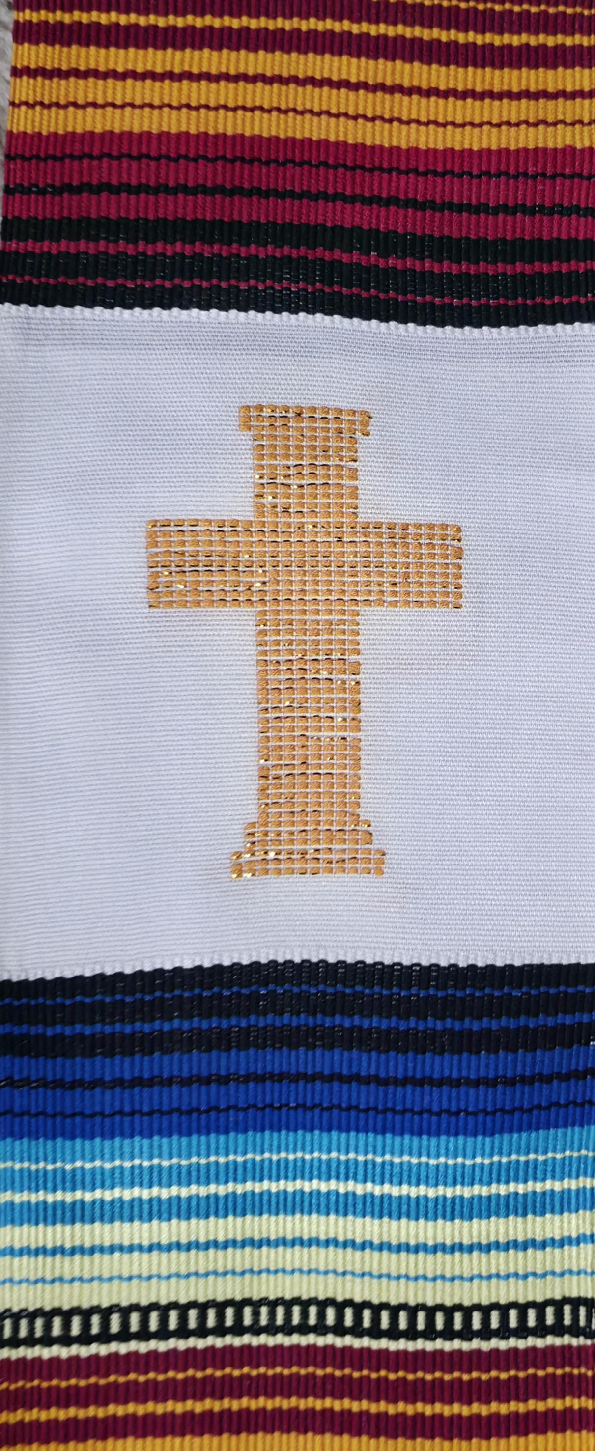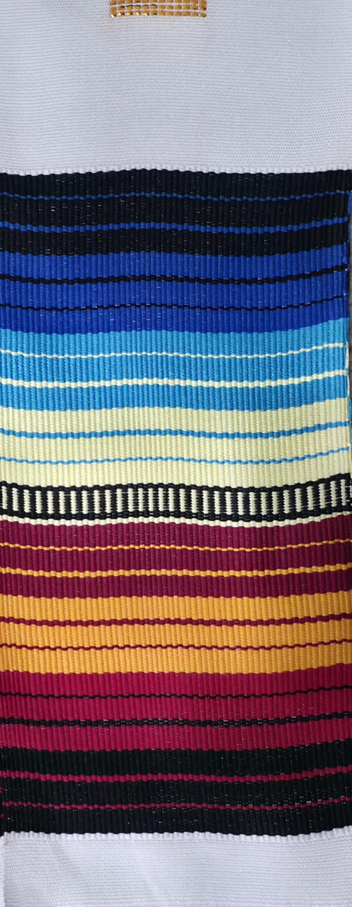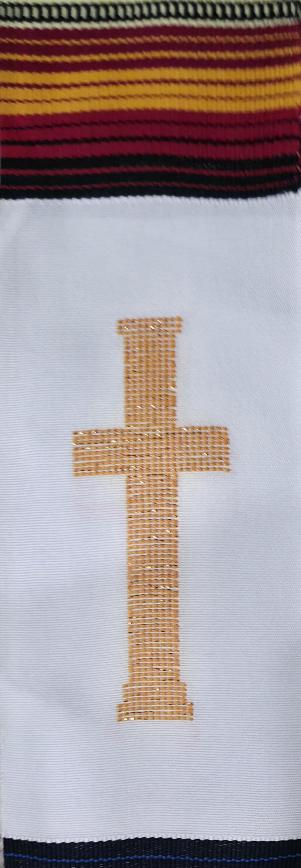 100"L x 4.5"W. Handwoven in Ghana.All kente stoles measurements are approximate. Since they are handwoven by numerous weavers/looms, it is impossible for all to be exactly the same length and width.