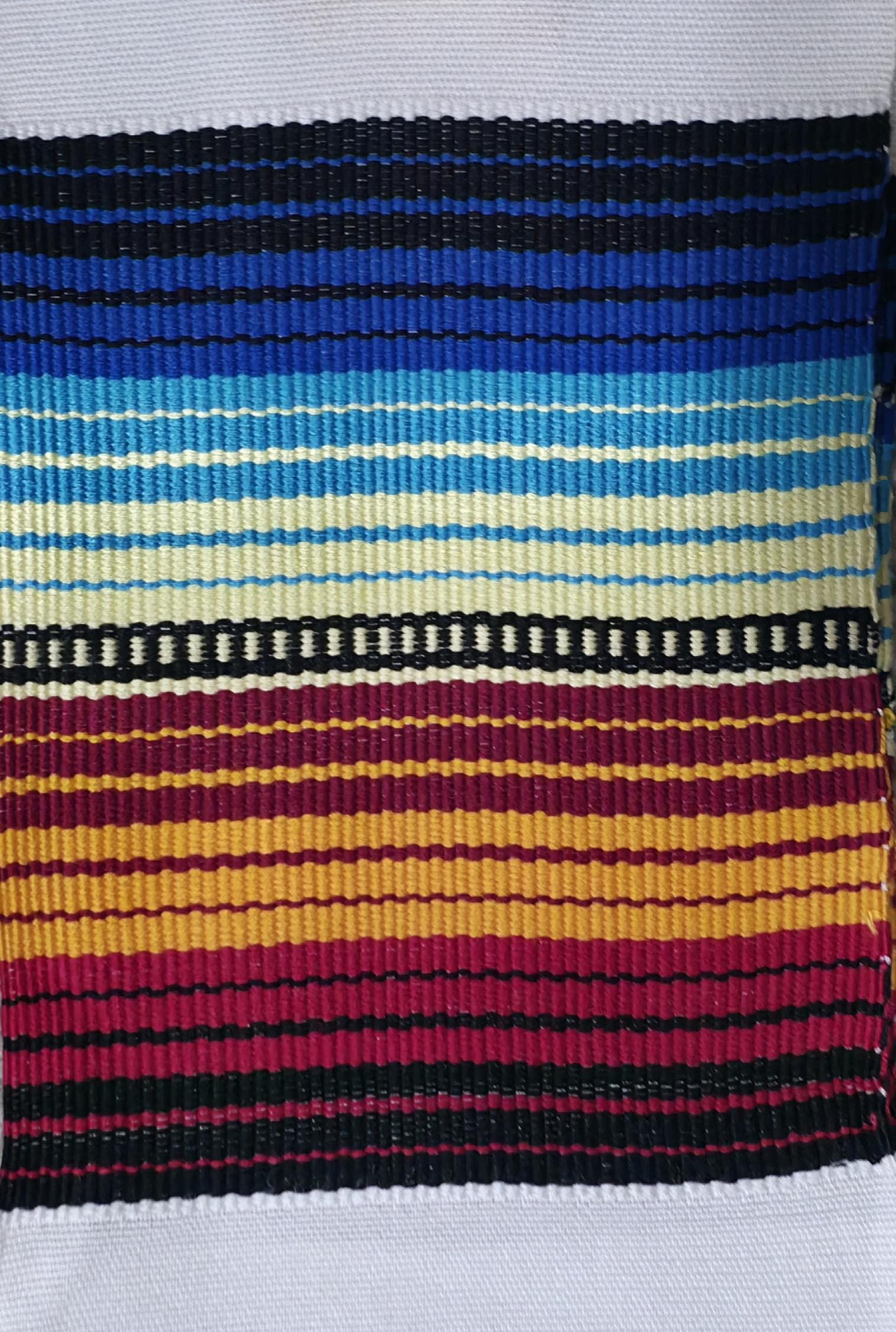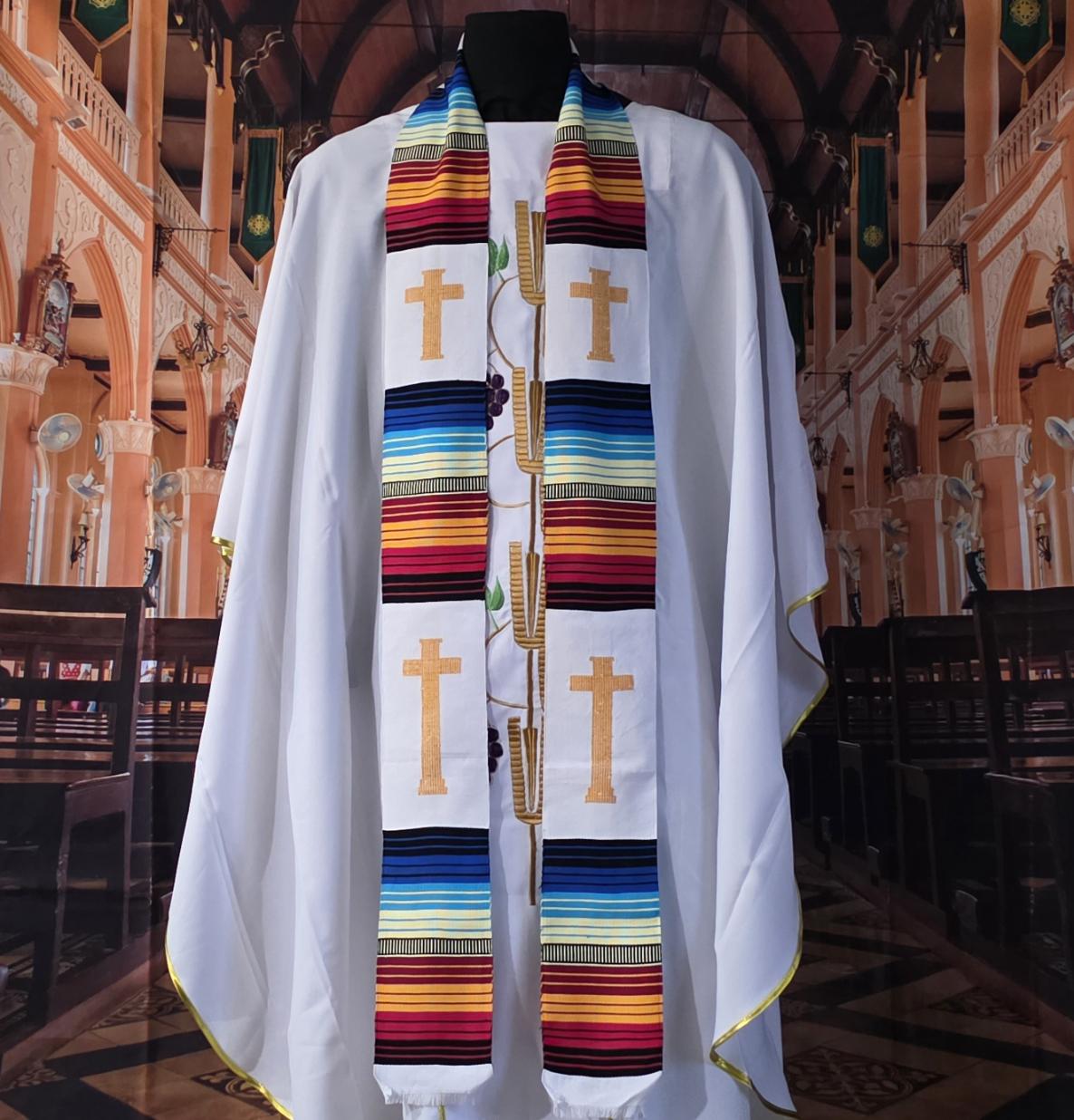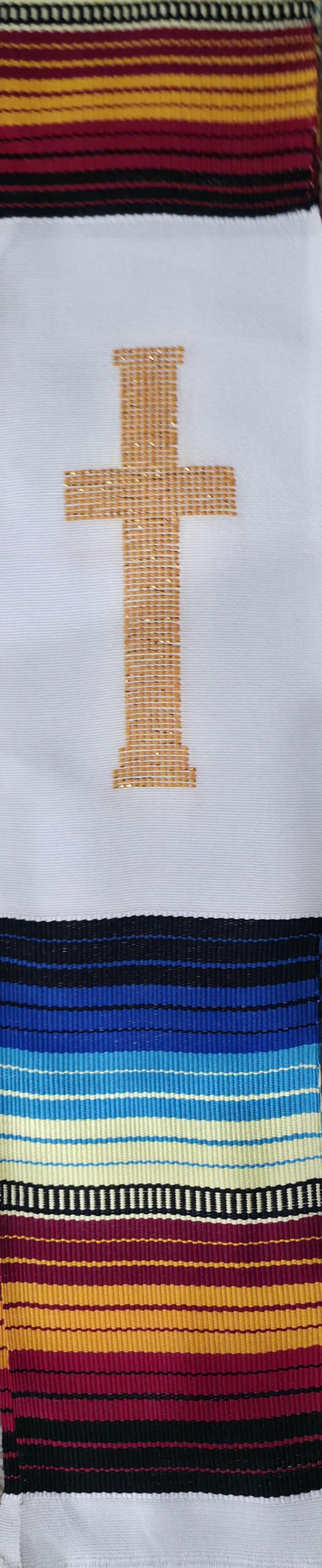 100"L x 4.5"W. Handwoven in Ghana.All kente stoles measurements are approximate. Since they are handwoven by numerous weavers/looms, it is impossible for all to be exactly the same length and width.