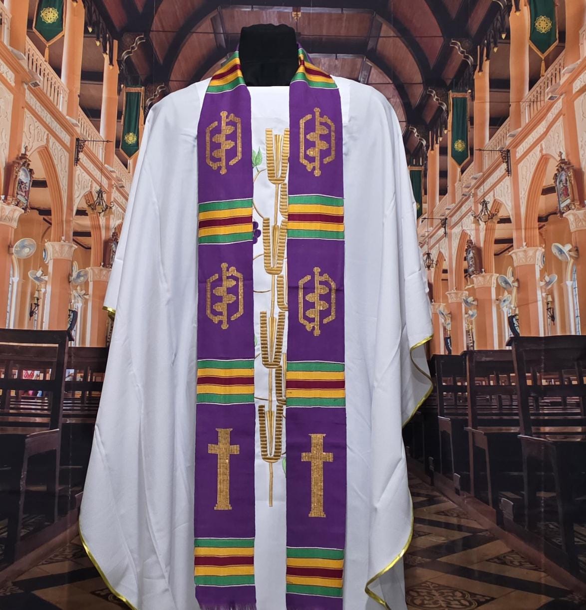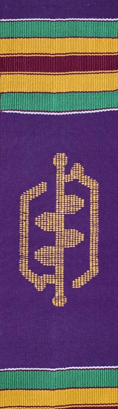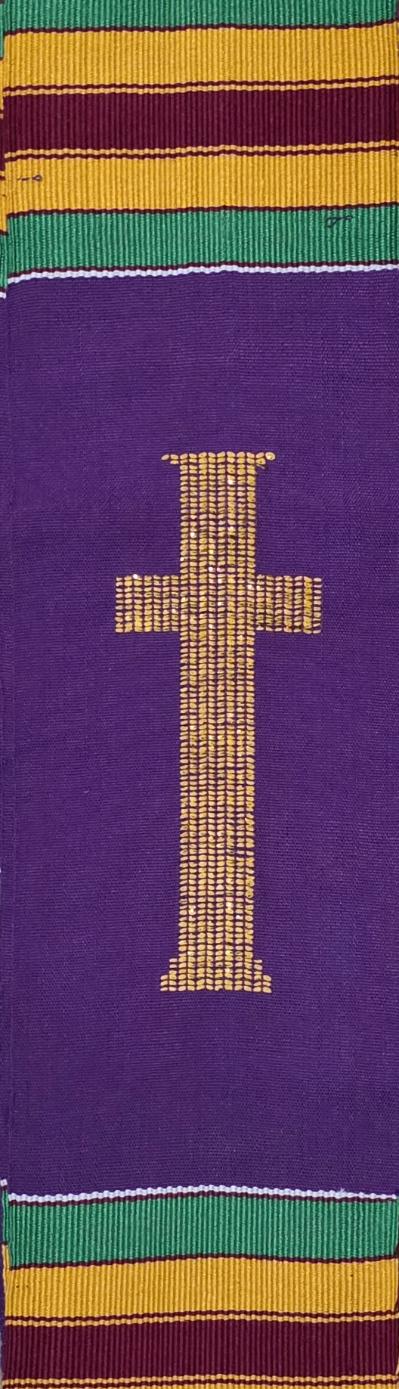 100"L x 4.5"W. Handwoven in Ghana.All kente stoles measurements are approximate. Since they are handwoven by numerous weavers/looms, it is impossible for all to be exactly the same length and width.
