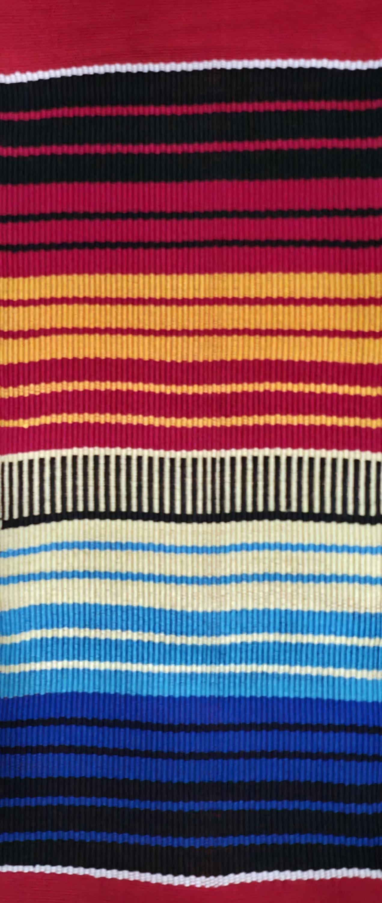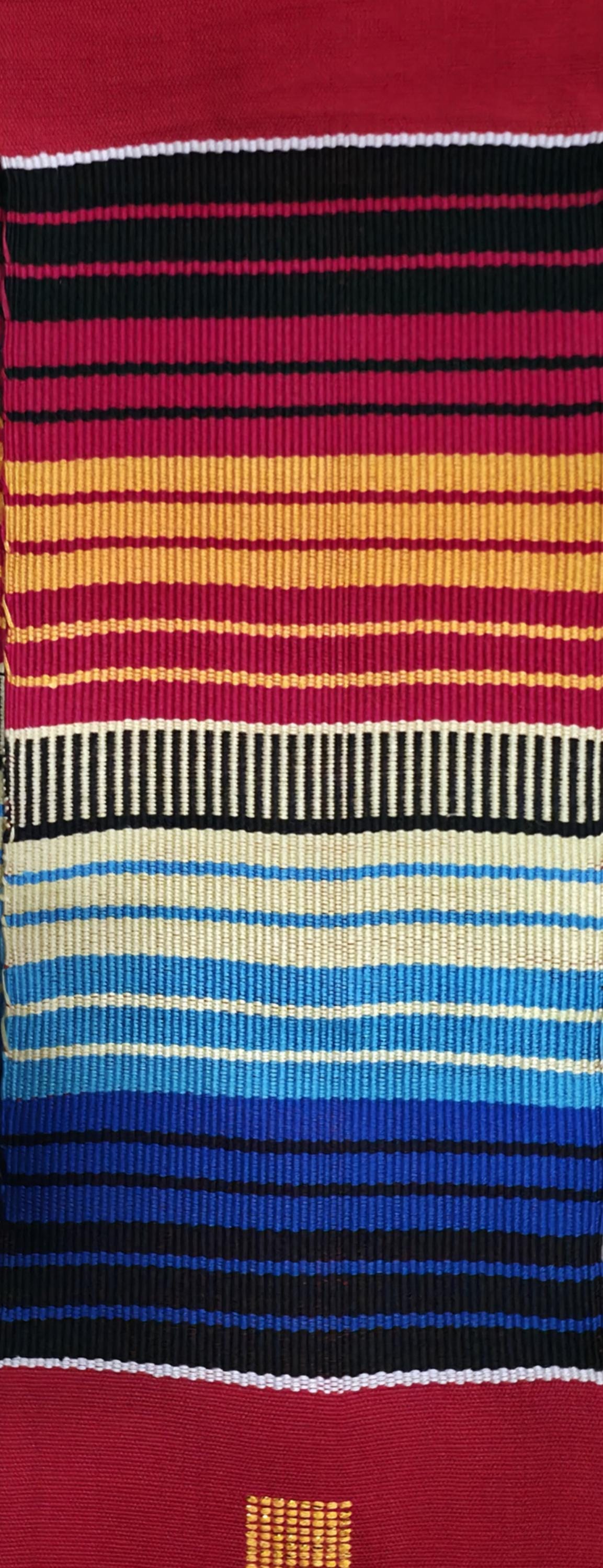 100"L x 4.5"W. Handwoven in Ghana.All kente stoles measurements are approximate. Since they are handwoven by numerous weavers/looms, it is impossible for all to be exactly the same length and width.