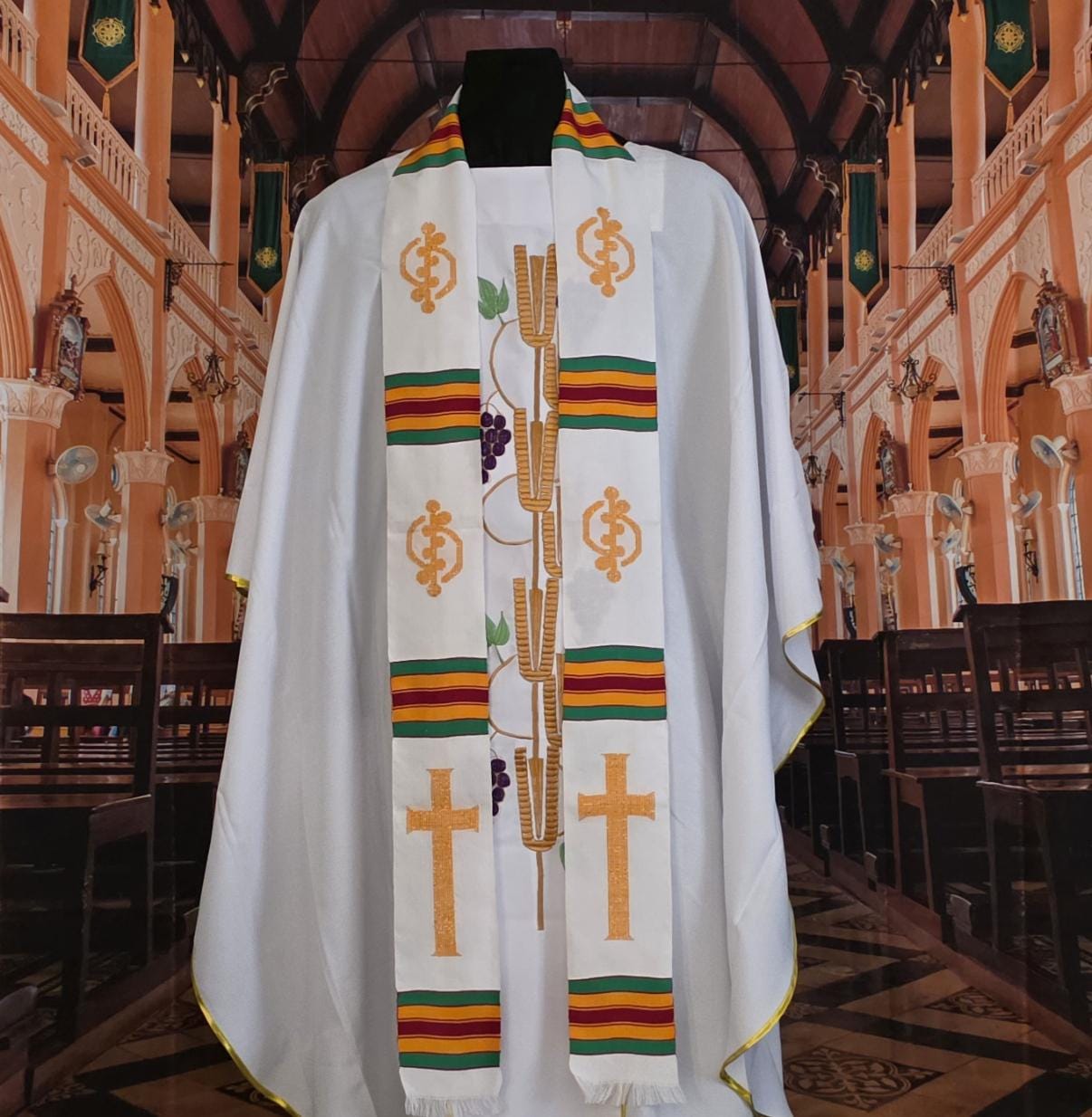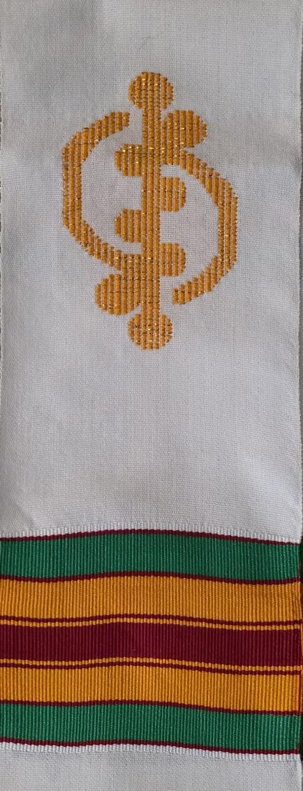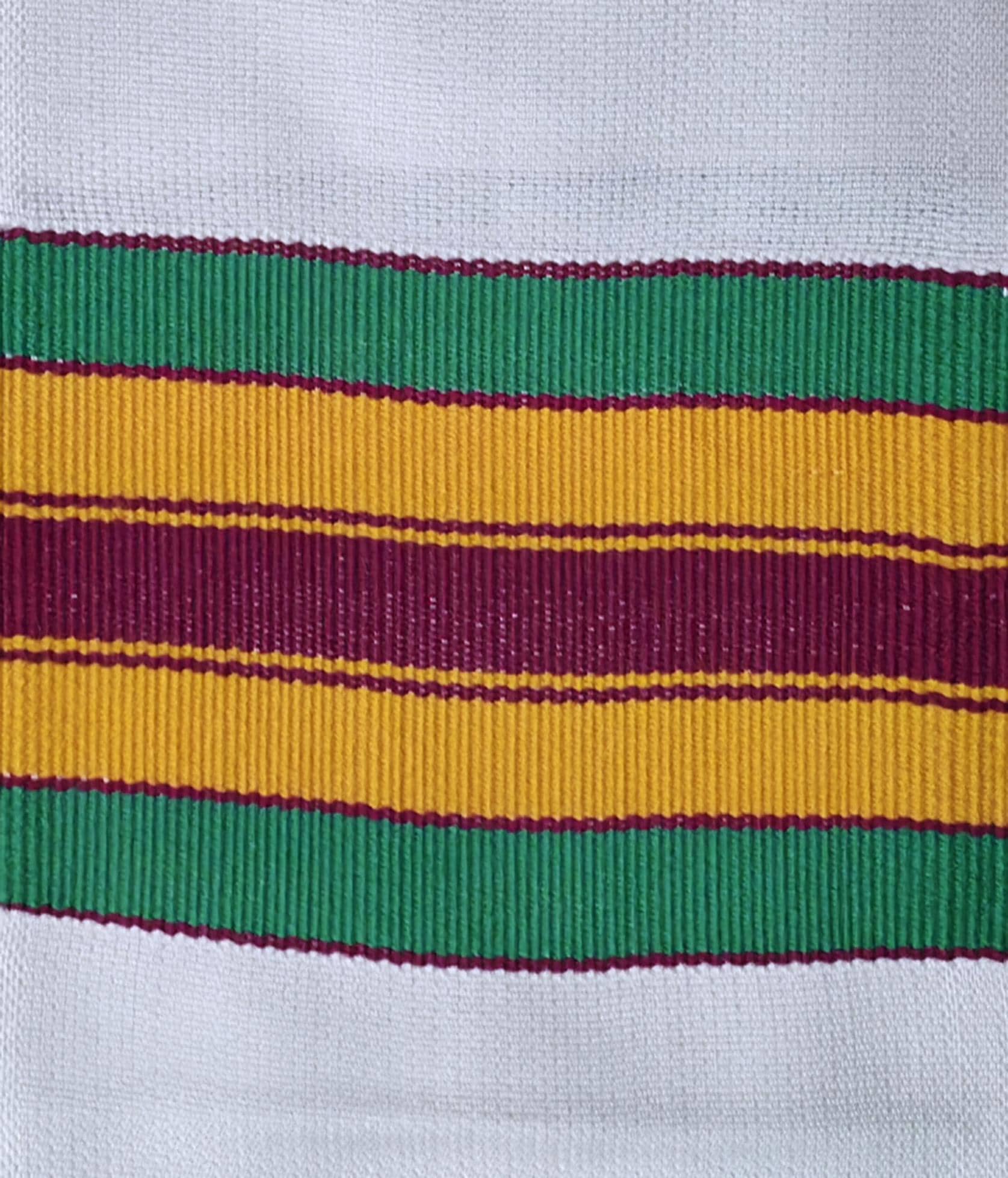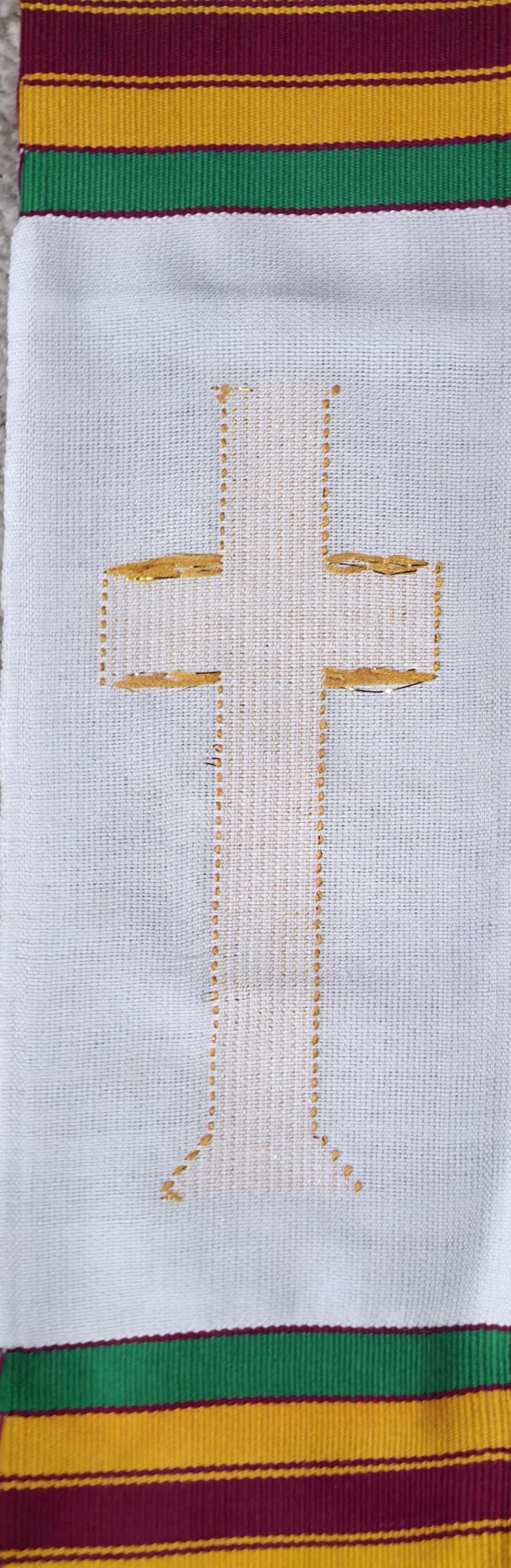 100"L x 4.5"W. Handwoven in Ghana.All kente stoles measurements are approximate. Since they are handwoven by numerous weavers/looms, it is impossible for all to be exactly the same length and width.