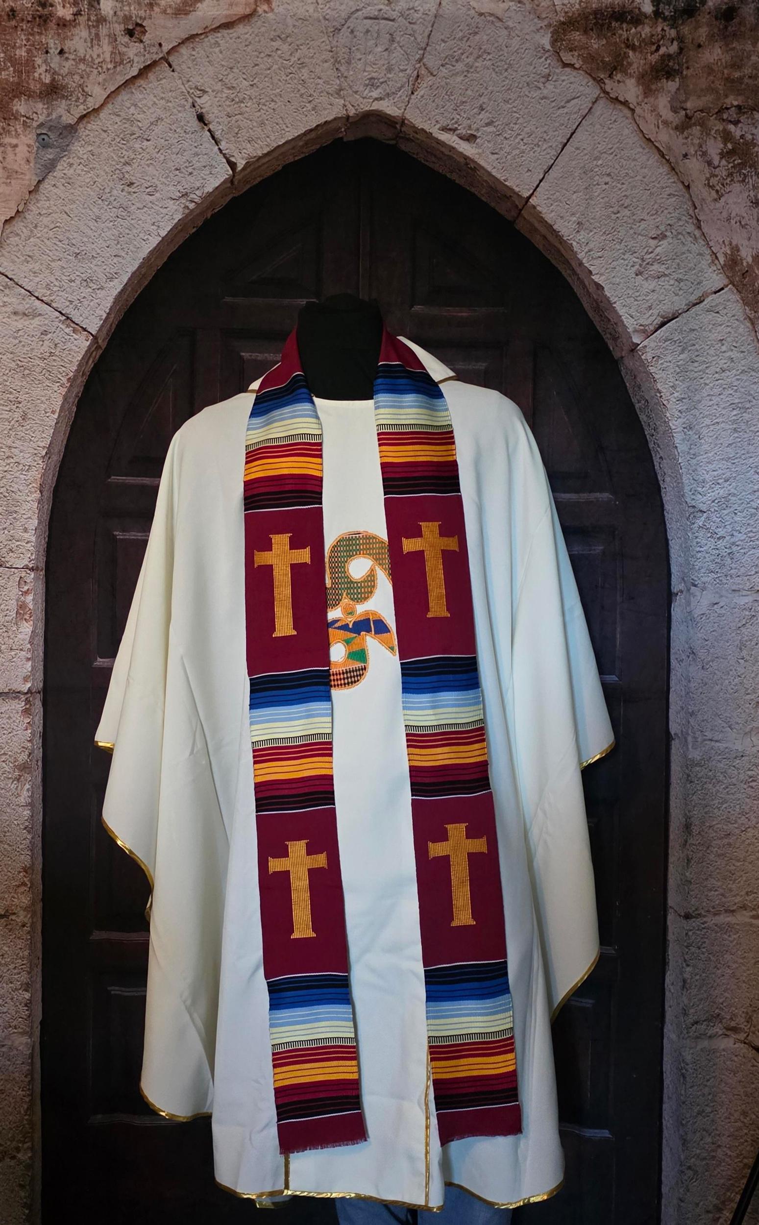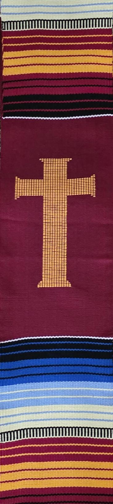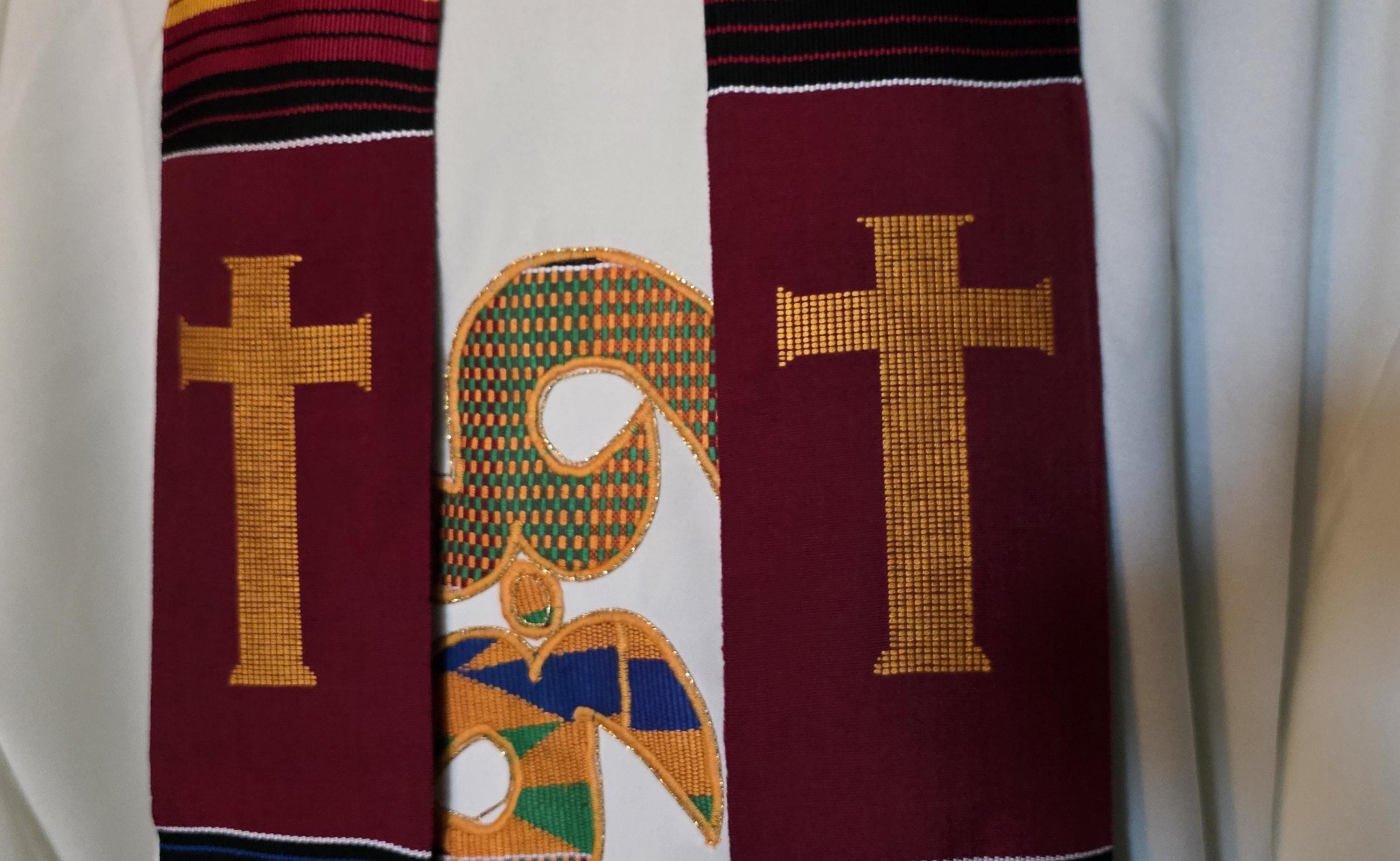 Multicultural Burgundy Kente Clergy Length stole.