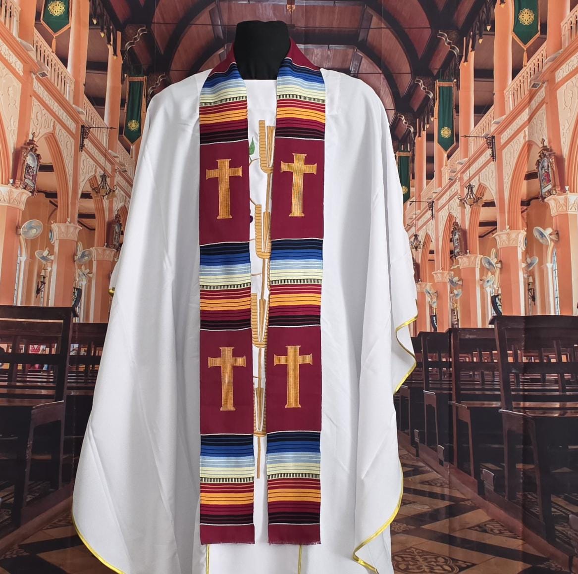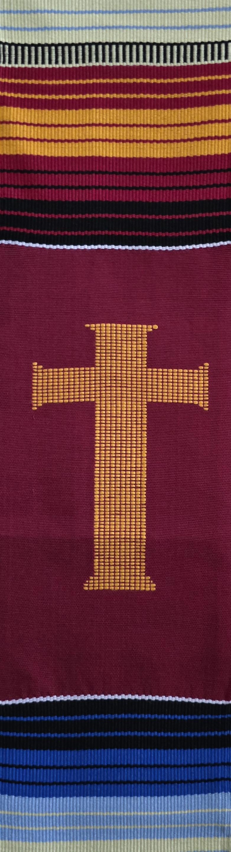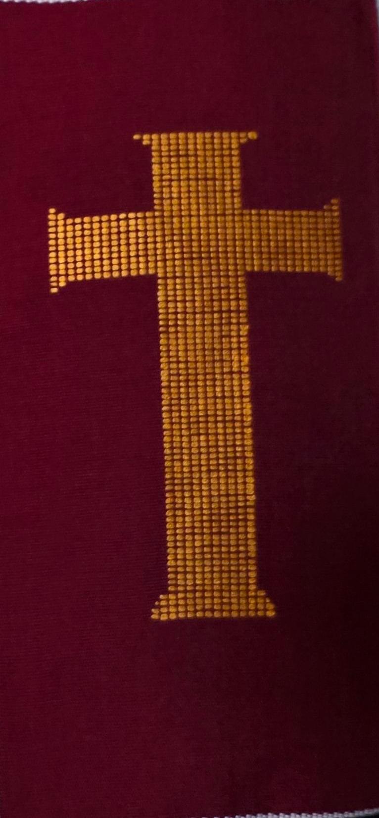 Multicultural Burgundy Kente Clergy Length stole.