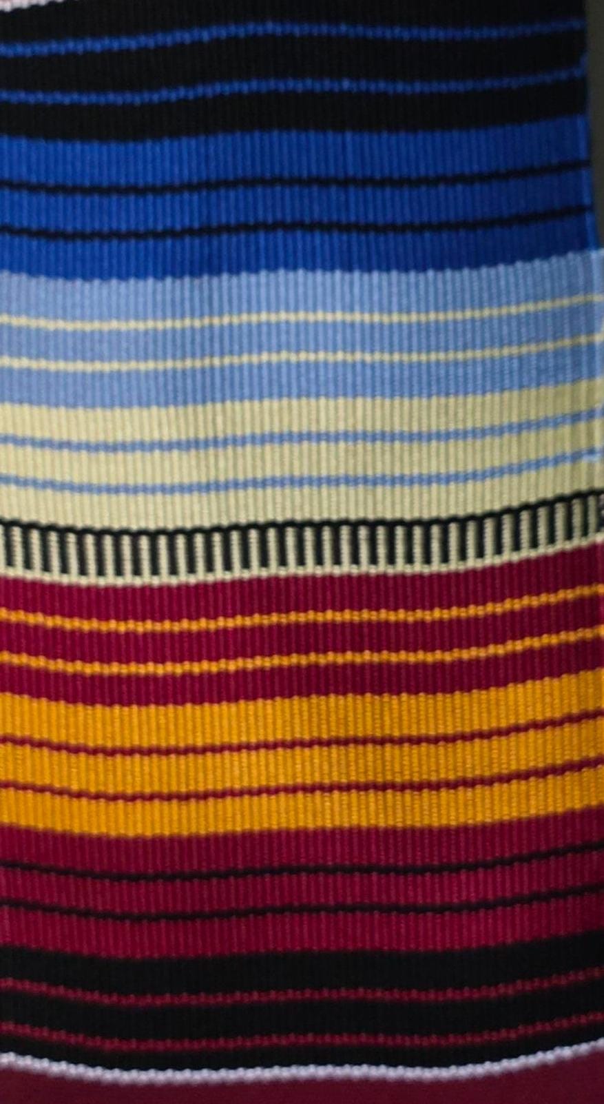 100"L x 4.5"W. Handwoven in Ghana.All kente stoles measurements are approximate. Since they are handwoven by numerous weavers/looms, it is impossible for all to be exactly the same length and width.