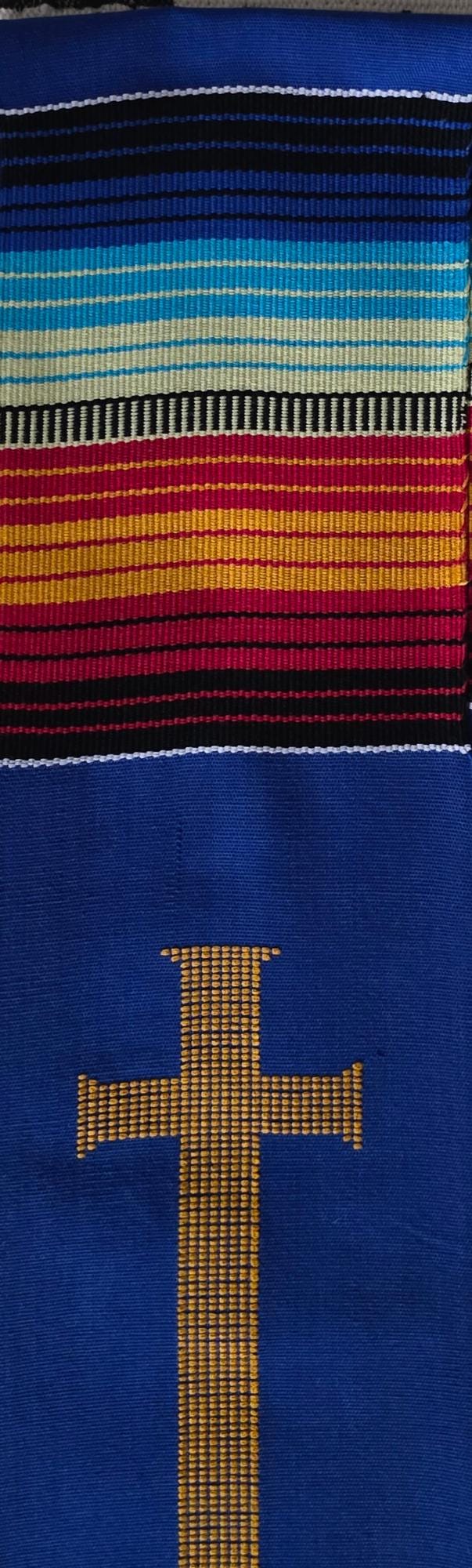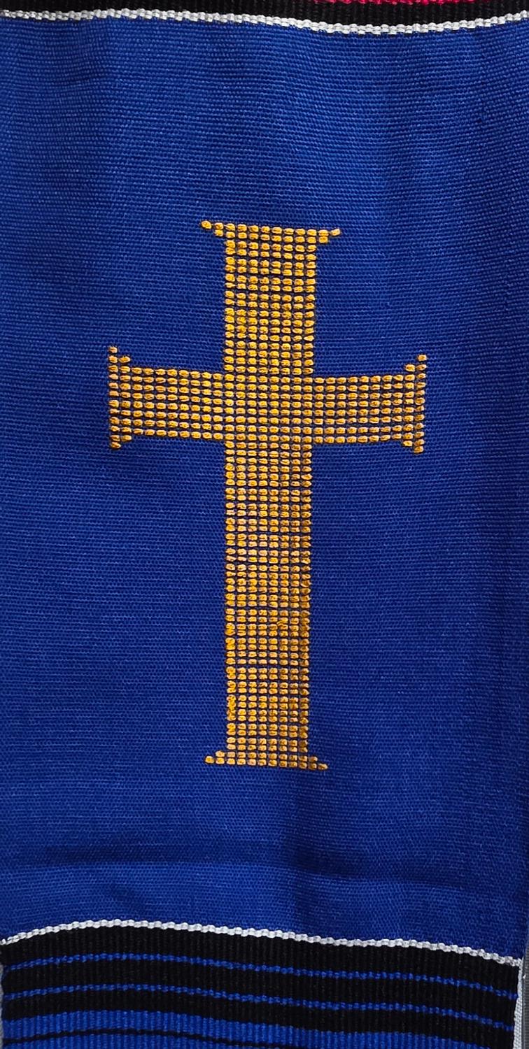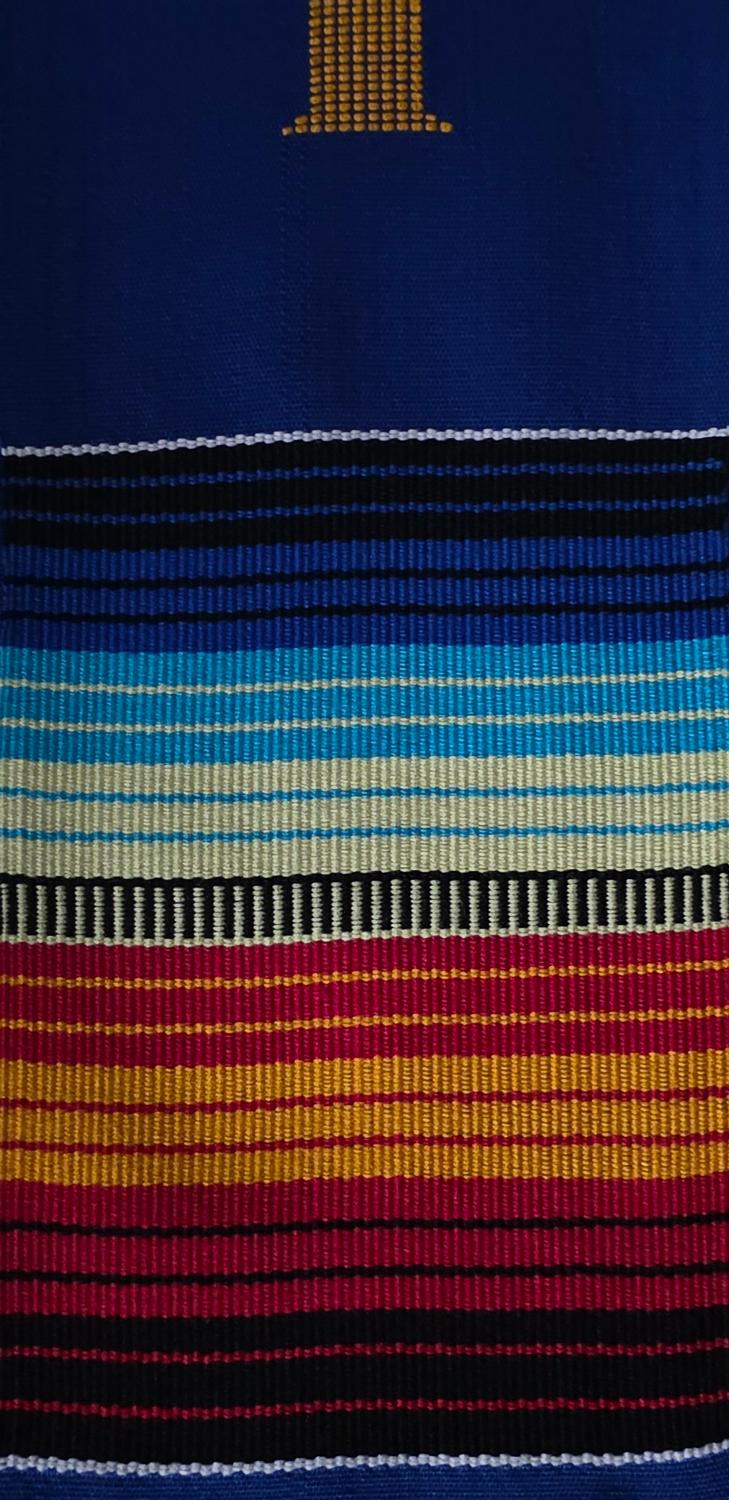 100"L x 4.5"W. Handwoven in Ghana.All kente stoles measurements are approximate. Since they are handwoven by numerous weavers/looms, it is impossible for all to be exactly the same length and width.