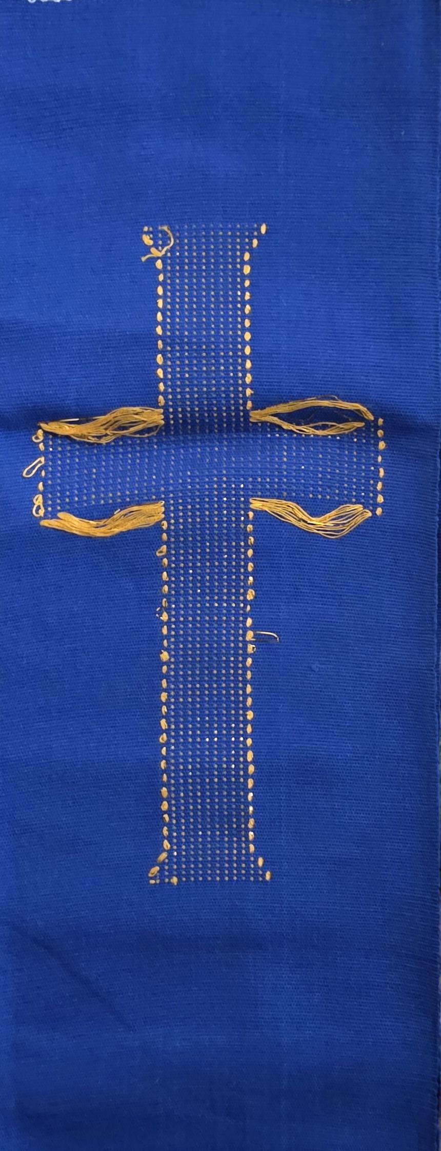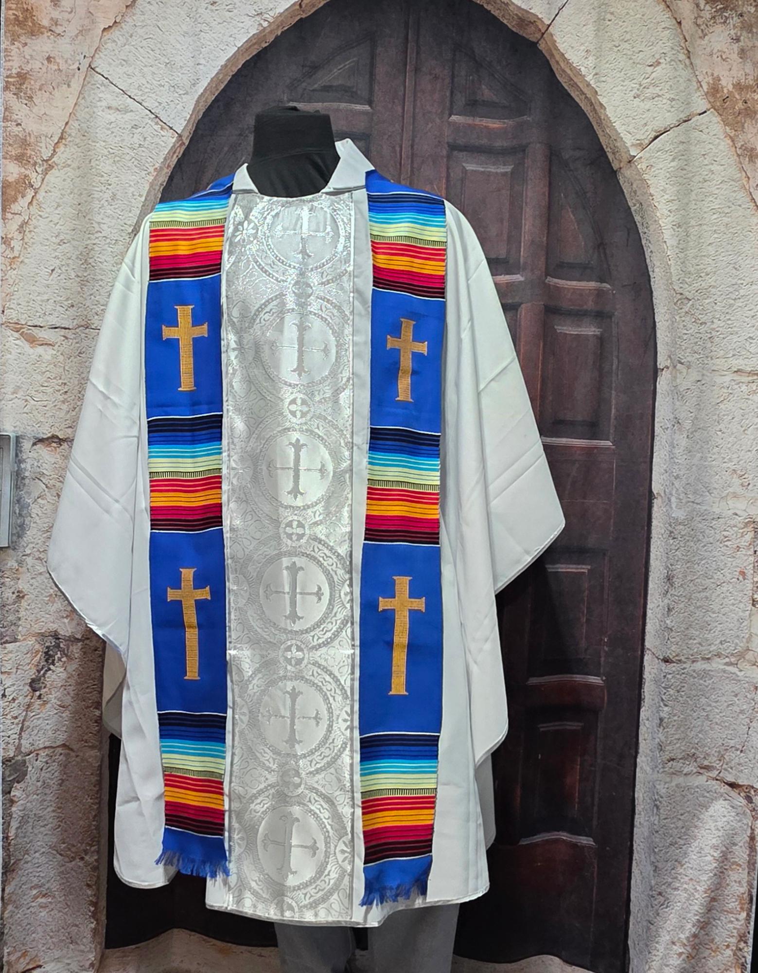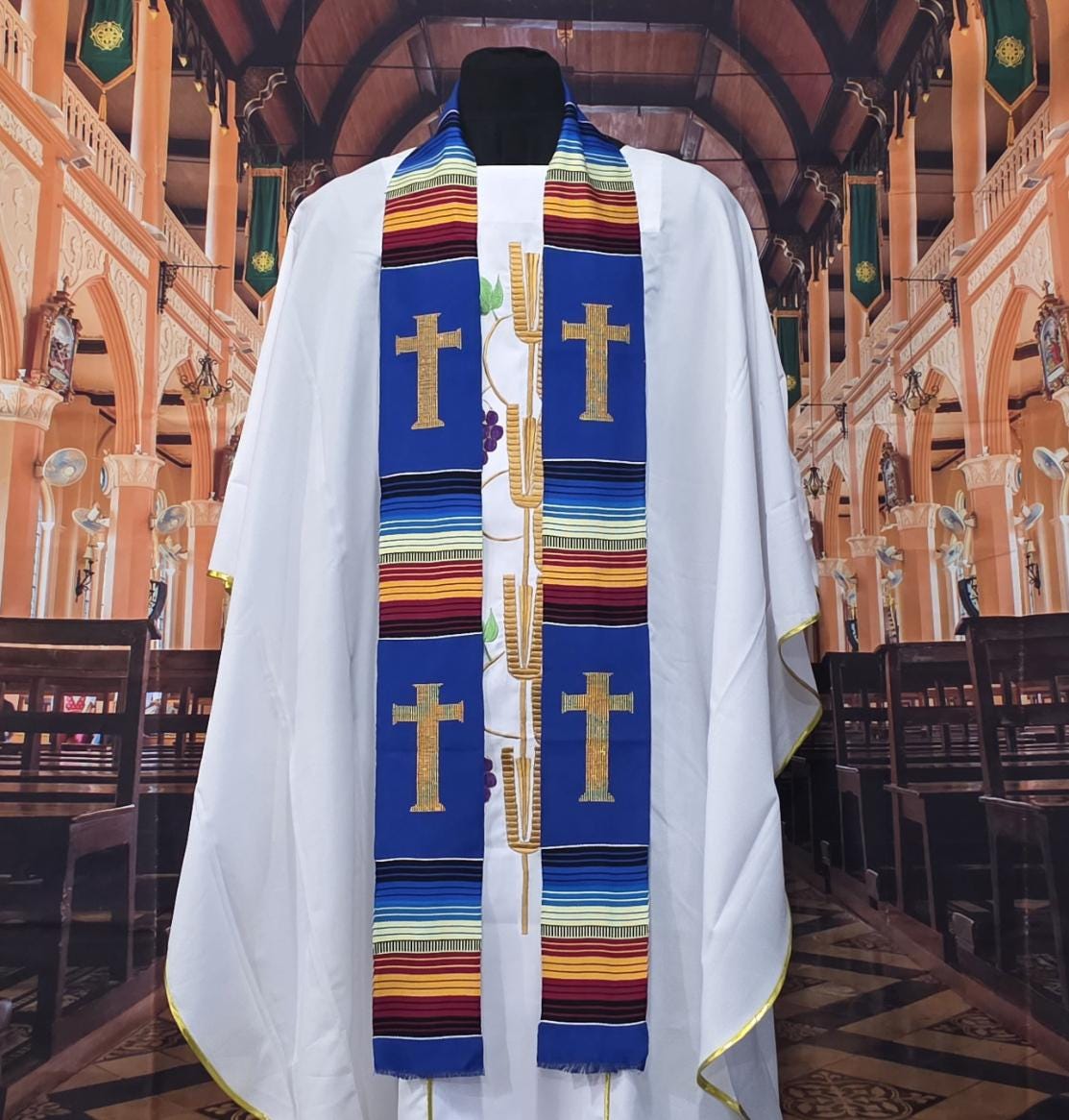 100"L x 4.5"W. Handwoven in Ghana.All kente stoles measurements are approximate. Since they are handwoven by numerous weavers/looms, it is impossible for all to be exactly the same length and width.