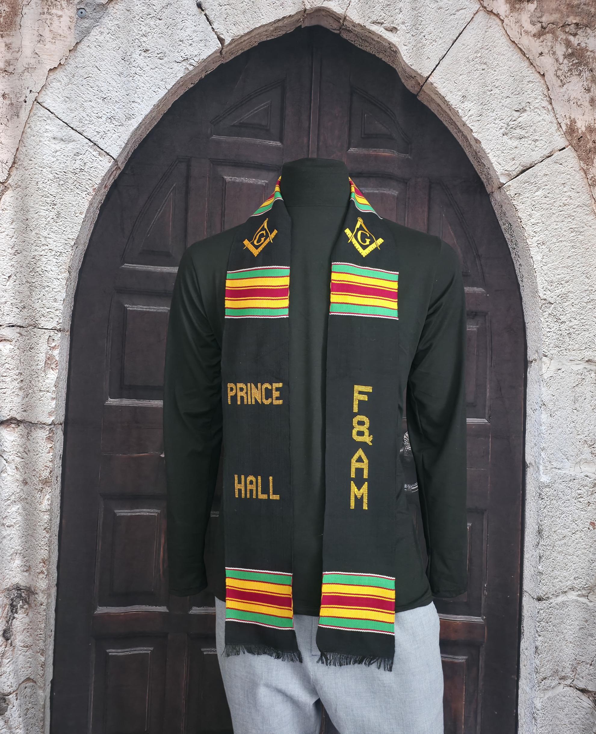 Masonic Prince Hall F&AM Traditional Black Kente Stoles. 2 Logos