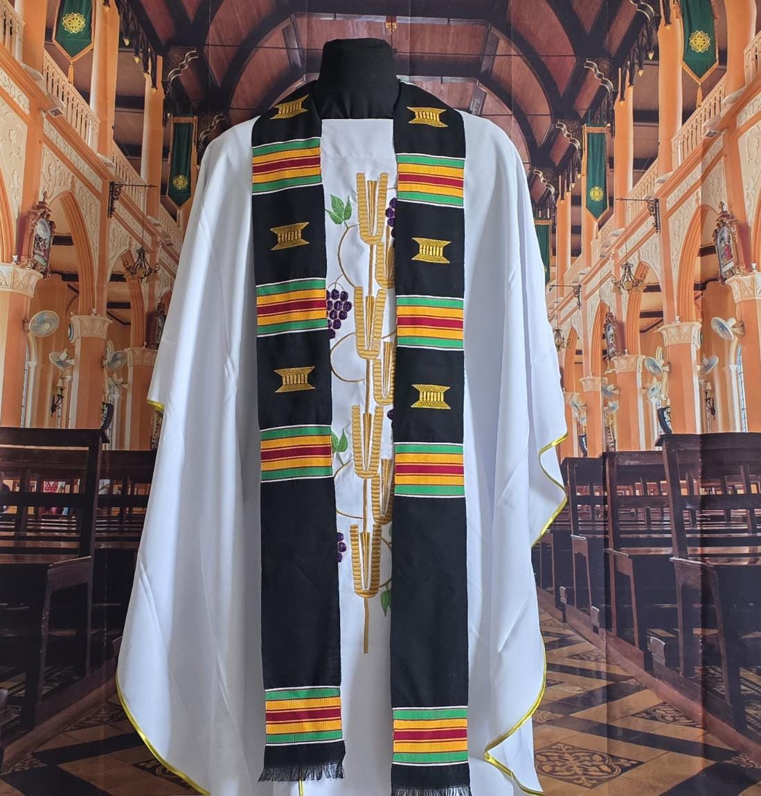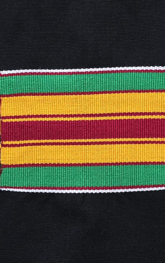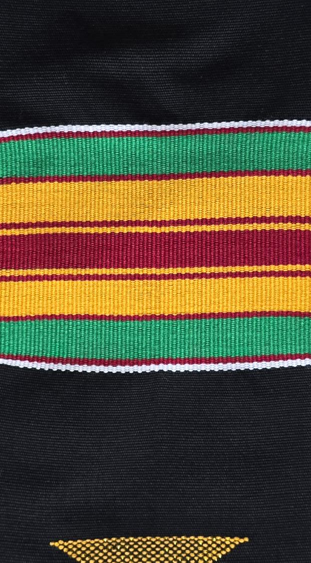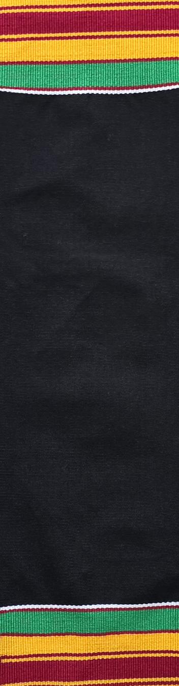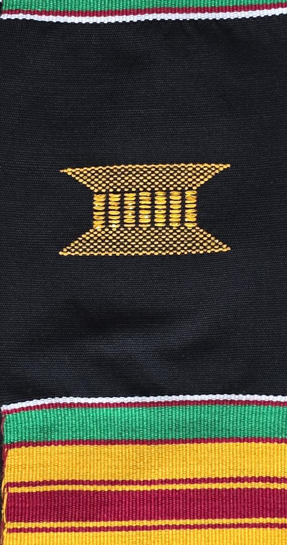 100"L x 4.5"W. Handwoven in Ghana. All kente stoles measurements are approximate. Since they are handwoven by numerous weavers/looms, it is impossible for all to be exactly the same length and width.