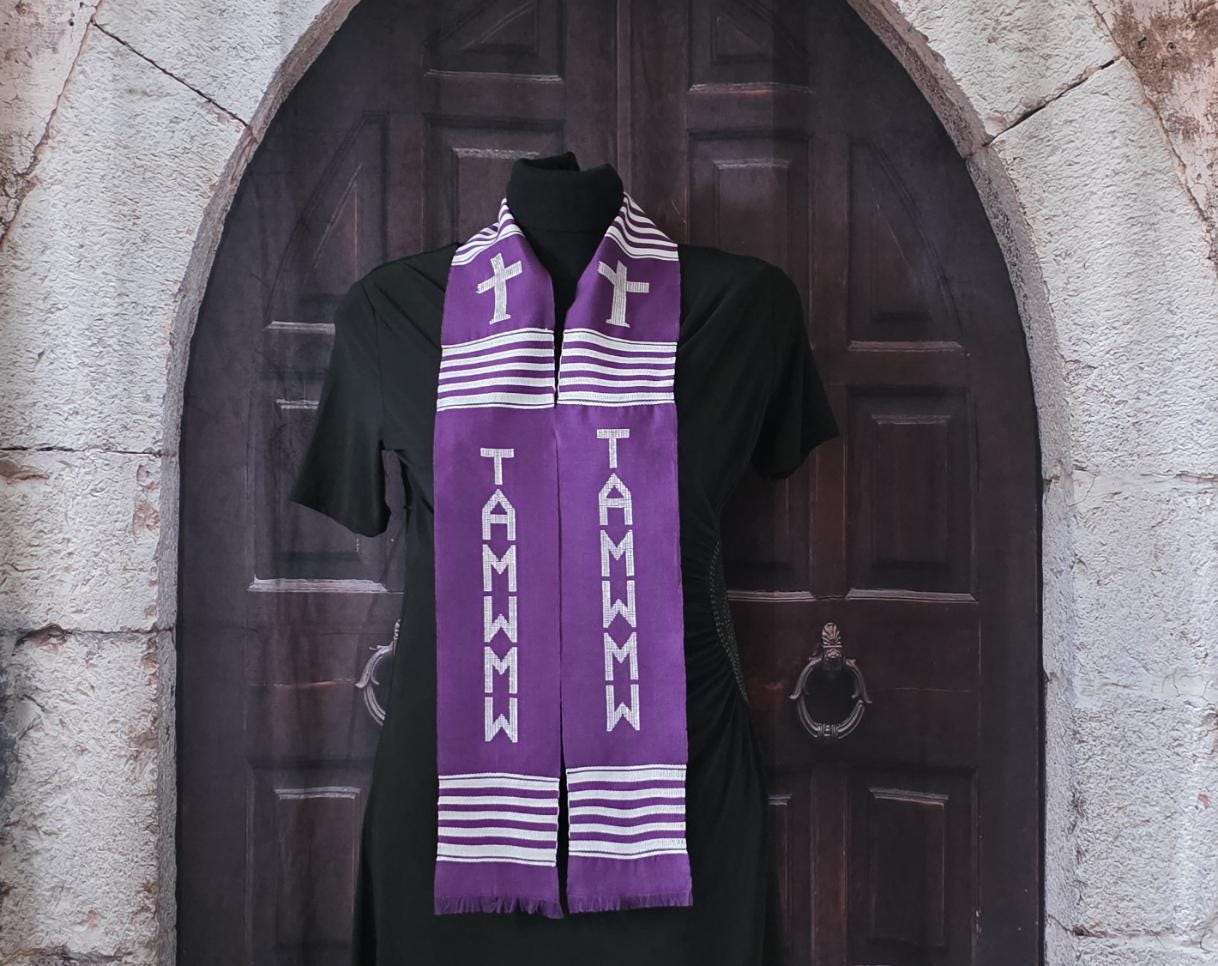 Texas Area Ministers' Wives and Ministers' Widows Kente StolesPurple and White Kente.Handwoven in Ghana. 72" x . 4.75".